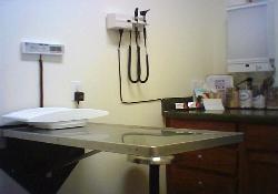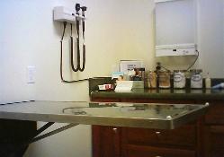 | Exam Room 1 All our examination rooms offer a wall mounted opthalmoscope, otoscope, and radiograph viewer in every room. |
